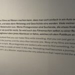 Wenn die Ausstellung in wie auch immer veränderter Form im nächsten Jahr nach Frankfurt wandert, muss ich wohl noch einmal hin. Wie man auch zu diesem oder jenem einzelnen Film von Wenders stehen mag, der unglaubliche Reichtum allein seines Kinoschaffens und der von ihm (und ggf. Kameraleuten) geschaffenen Bilder ist wohl in dieser Form und Fülle ohne Vergleich. Ein großes, vielschichtiges Werk sondergleichen, quer durch die Jahrzehnte und Themenabschnitte auch von Wim selbst kommentiert, so zum Beispiel hier über Orte und Amerika im Speziellen und über das Reisen.