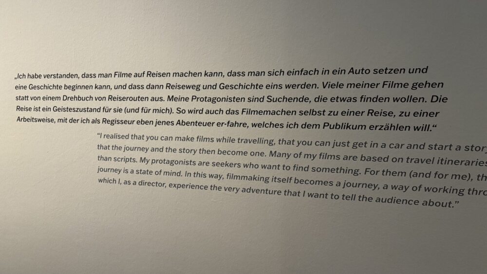 Wenn die Ausstellung in wie auch immer veränderter Form im nächsten Jahr nach Frankfurt wandert, muss ich wohl noch einmal hin. Wie man auch zu diesem oder jenem einzelnen Film von Wenders stehen mag, der unglaubliche Reichtum allein seines Kinoschaffens und der von ihm (und ggf. Kameraleuten) geschaffenen Bilder ist wohl in dieser Form und Fülle ohne Vergleich. Ein großes, vielschichtiges Werk sondergleichen, quer durch die Jahrzehnte und Themenabschnitte auch von Wim selbst kommentiert, so zum Beispiel hier über Orte und Amerika im Speziellen und über das Reisen.