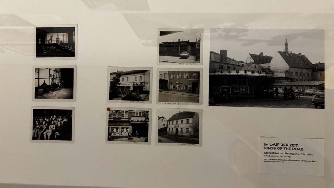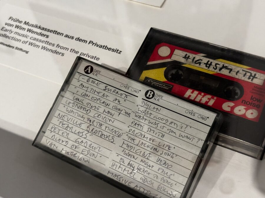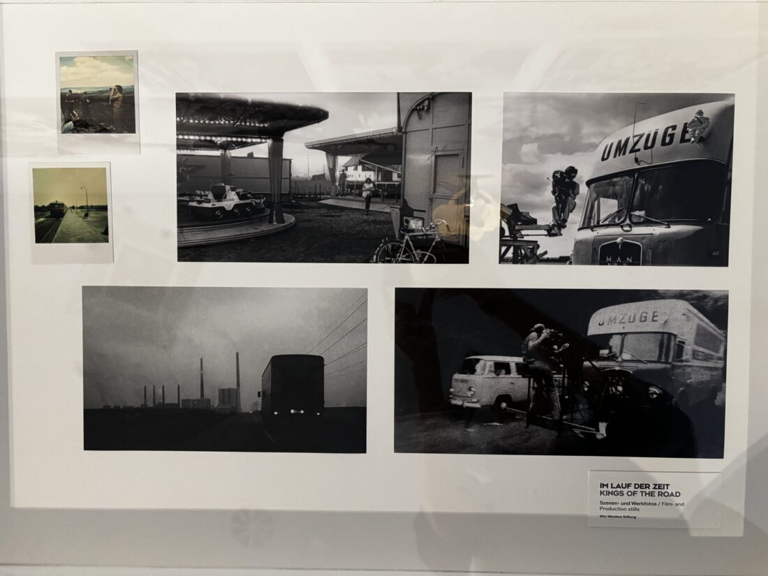 Also blieben mir noch zweieinhalb Stunden für Wenders, direkt gegenüber, und das schien mir noch bei den ersten Ausstellungstücken auch eine gut ausreichende Zeit zu sein, doch wird die Ausstellung, je weiter man durch sie hindurchgeht, immer zeitverlangender. Man trifft auf viele sehr gut kuratierte Filmausschnitte und beeindruckend umfangreiche Materialien aus Wims Laufbahn: etliche Gemälde aus seiner Frühzeit, die vielleicht nicht weltbewegend sind und denen man ihre Einflüsse auch deutlich ansieht, die allerdings zumindest ich zuvor aber nie gesehen hatte, unzählige Recherchematerialien von allen möglichen Projekten vom Debütfilm Summer in the City bis zum bisher letzten, Perfect Days, Fotografien in allen vorstellbaren Größen und Qualitäten, Arbeitsfotos, private Stücke und Einblicke in seine Inspirationen und Einflüsse … usw.…. dann gibt es auch ein paar 3D-Filme zu sehen, die man sonst kaum einmal zu Gesicht bekommt und von denen ich nicht einmal wusste… es gibt vier von Wenders eigens für diese Ausstellung editierte Multikanal-Installationen, die vielleicht nichts eigentlich Neues bieten (doch, ich entdeckte unter den vielen verarbeiteten Ausschnitten einen Filmtitel, von dem ich wohl noch nie gehört hatte), aber in der Neuanordnung und vor allem der monumentalen Größe und der dazu editierten Musik doch beeindruckend sind – darunter eine wilde Collage zum Thema Fahrten und Reisen zur Musik von Canned Heat.