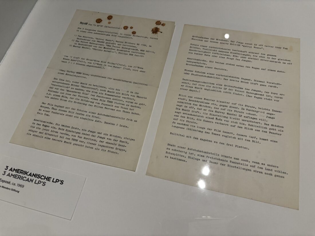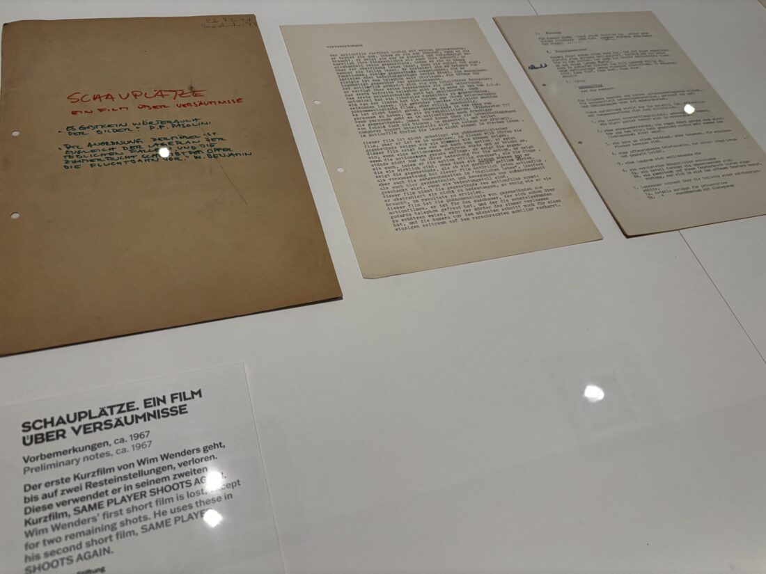 Und dann gibt es am Ende auch noch zahlreiche Drehbuch-, und Arbeitsseiten zum Lesen, nebst Briefkorrespondenzen mit Leuten wie Willy Brandt, Nick Cave, Lou Reed… einen Darstellervertrag mit Gorbatschow (In weiter Ferne, so nah), Original-Drehbücher aus Wims Studienzeit, von teils verschollenen Filmen, weitere Nebenwerke wie ungewöhnliche Werbefilme und einen Kurzfilm zum 80. Jahrestag der Kapitulation (auch im „Zeit“-Podcast angesprochen), alles in Form von Bildschirmen mit Kopfhörern, Interviews… und einiges mehr… ich konnte am Ende dann doch nicht mehr alles ordentlich betrachten, durchlesen und anhören, diese vielen Materialien in den unmittelbaren Schreib- und Vorbereitungsprozess konnte ich leider nicht mehr ausreichend betrachen (und mein Smartfon hatte längst keinen Akku mehr, um noch etwas abzufotografieren) und wurde um 18 Uhr als letzter aus den Ausstellungsräumen hinauskomplimentiert. Daher habe ich sogar vergessen, wenigstens einen Blick auf die große Wand mit den Trophäen zu werfen. Nur den Goldenen Löwen habe ich im Vorübergehen gerade so gesehen.