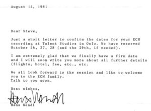 Kleiner Nachtrag: in der Sendung sprach ich von der Produktionszeit von „Northern Song“ in Oslo: „Zwei Tage, ECM-style“. Nun, es waren drei, vier Tage, wie aus folgendem Dokument hervorgeht…