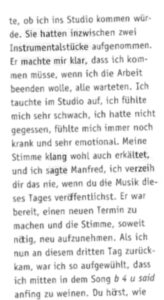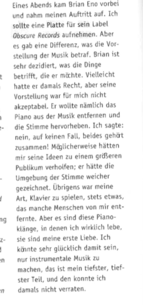 I met Annette Peacock in Munich (in the summer of 2000), and she told me, at one point, about sensitive moments in the production. Once, in the morning, she felt her energy waning, couldn’t make the appointment, everything was up in the air. Manfred Eicher carefully knocked at her door. Helpful words, encouragement. It ended well. Fortunately. By the way, she never got together with Brian Eno (they would have made an interesting pair in the studio), but once, early in the seventies, he lent her a wonderful pair of old horn loudspeakers, she fell in love with their sound and never gave them back. Here‘s the old interview. Life‘s backward glance.